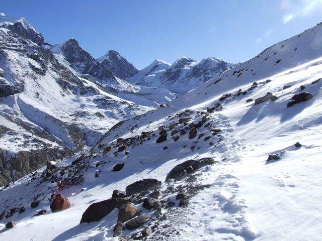 Around us the big snowy peaks of the Himalaya towered above us and no more trees at this stage, the views became more beautiful every day and we spend the night before the pass huddled around the fire wondering what the next day would bring.
