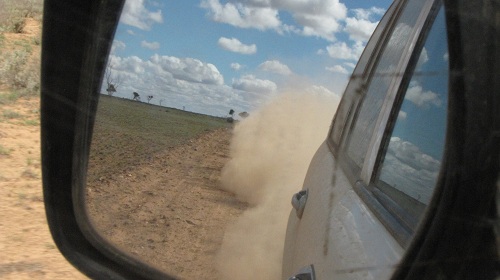 Good thing it’s a really big car, so at least people get out of my way.dusty road