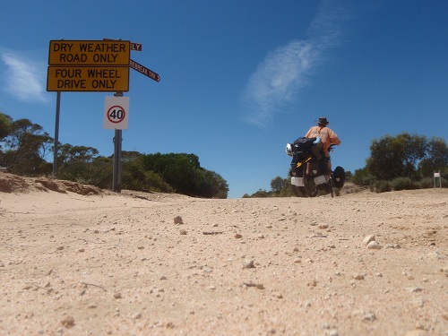 The only vehicle I did meet was a big 4WD who flew past me later that day while shouting out the window: “How ya going!”…. typical Aussie greeting, he wouldn’t have expected an answer. If I would’ve had the chance I’d let him know that, obviously, in the sand… uphill, and against the wind I was going very very slowly. But he sped past and left me in a thick cloud of dust.