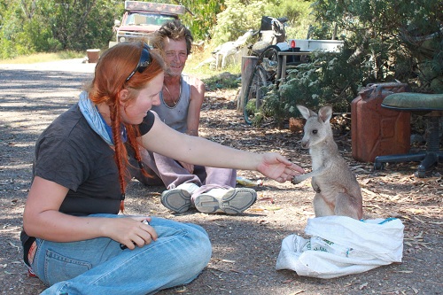 He proved to us what a funny sound the turkeys made by throwing a beer-bottle at them. And let me feed his baby-kangaroo who pood all over me.