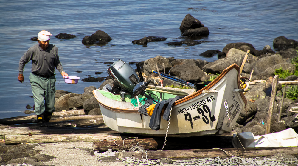 Here’s a fisherman looking for sea urchin while steering his boat with his feet.