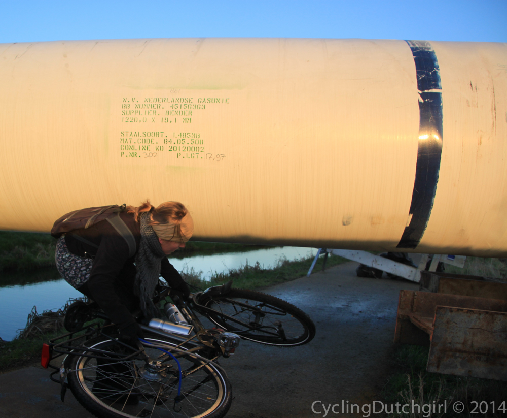 I got a small surprise as cycling along I suddenly came across a huge pipeline over the bicycle path. Of course there would’ve been a way around it, but not one to turn back I decided to climb over a bridge and crawl under the line to continue along the other side.